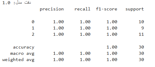 دقت مدل: ۱٫۰ یعنی مدل تمام نمونهها را به درستی پیشبینی کرده و دقت یا Accuracy برابر ۱۰۰٪ است.